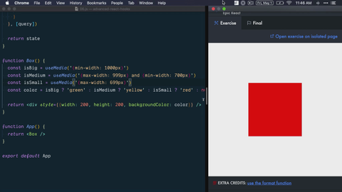 0:19 I give you an example of how to use this particular hook that it's pretty simple, straightforward. This is exercise is going to be a quick one for you. Feel free to take a look at the exercise and what we've implemented in our custom Hook. Basically, what we have here is a box, and we have three useMedia custom hooks usages here.