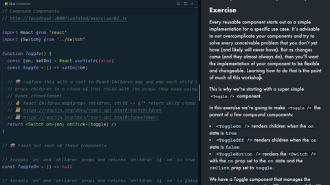 00:35 with the flexibility and capabilities of components when we build them like this. So compound components are a great way to solve this problem. And in each one of these, I'm gonna show you some real-world projects that use these patterns. So feel free to jump in to Reach UI because that's a great example of components that use the compound components pattern.
