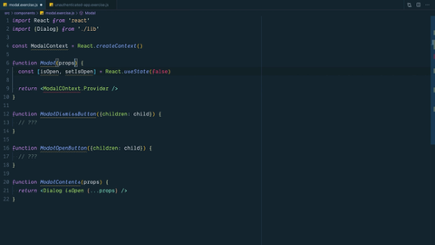 Kent C. Dodds: 0:00 Let's start out by making the API that we want to have exist and then we'll go ahead and build that API. What we want to be able to do is have a modal component, and inside of that modal component we want to have a control for the openButton. We'll have a modalOpenButton.