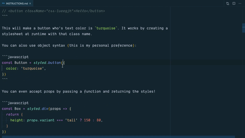 0:45 There are couple ways that you use Emotion to create styled components. These are components that carry their styles with them. Here, you render this component that you get from a styled button. It will give you a component that has a className and that className will be associated to a style sheet that has it set to this particular set of styles.