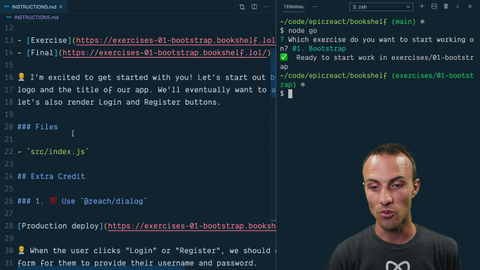 0:45 I'm excited. Let's jump in. Here is our bookshelf app. It's kentcdodds/bookshelf on GitHub. Lots of it is the same in the way that you get it set up. We still have the same requirements. We have the setup script that you run, but things are a little bit different.