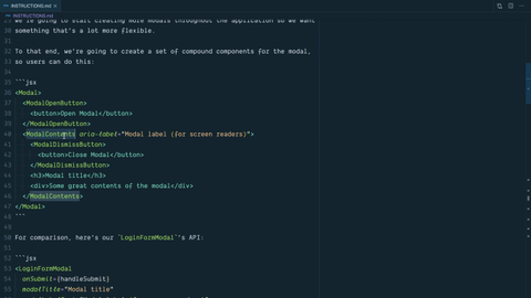 0:29 Your job will be to create the components for modal, modal open button, modal contents, and modal dismiss button. These components should implicitly share state in a way that makes it so users of these components don't need to worry about that state that's managed internally, which should hopefully not only allow us to get rid of this half-baked abstraction that we have here, but also allow us to use modals throughout our application in a way that's truly reusable.