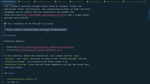 0:44 For this exercise, we're going to put the user login register and logout functions into Context and then pull those things out of context. In all of these files, we'll no longer need to pass the user prop or the login/logout props. Instead, we'll be able to pull those out of our AuthContext.