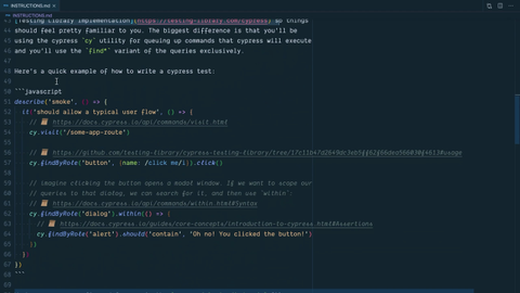 0:49 Here's a quick example of how you write a Cypress test that you can look over with some inline links to different documentation that you might find useful, and some explanation of some of the things we have preconfigured for you already.