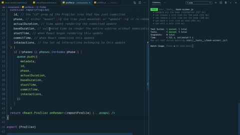1:37 It means that we'll never import this module, so we'll never set this interval to start sending the Profiler queue every five seconds. With that, let's just make sure this is going to work out, and voilà, our test continued to pass, and we don't have to worry about setting that interval or rendering that Profiler component.