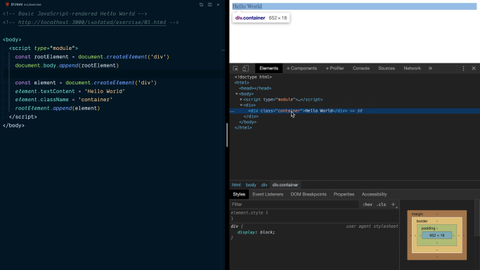 0:39 If I save that, it works just fine, just exactly as I had before except now, I'm actually doing the creating of that root element DOM node and appending that to the body. Then we append this element to that DOM node that I created.