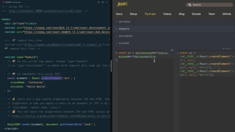 1:07 Play around in here to see what the JSX gets converted into. Ultimately, your job is to take what we have today and convert it to JSX syntax. Play around with that. One thing that I would strongly advise is the better that you're able to take a look at JSX and convert it into createElement calls in your head, the better you'll be able to read and use JSX effectively.