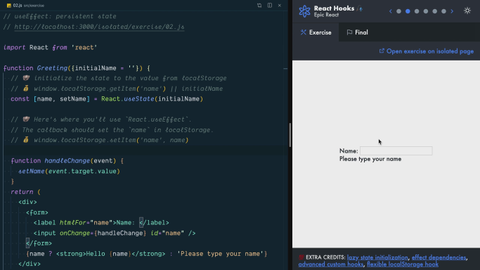 0:38 In the final version, if we type a name like Bob, and then we refresh, when we go to the final version again, we're going to see Bob preloaded because it was saved in local storage, and we retrieved it from local storage when we got our state initialized again.