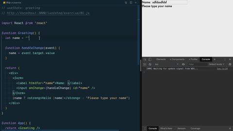 Instructor: 0:00 We need to manage some state because as I type in here, I want to get my name written out there so that I get my greeting showing up. The first thing that we're going to do is I got to get rid of this name variable because that's just a constant variable. It's not going to change over time. I need React to re-render here.