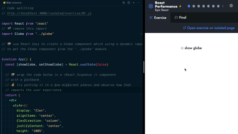 0:40 We'll take it a step further with React and its built-in support for dynamic imports. You can take a look at that as well. One thing that's important to note is that the thing that you're importing dynamically should have a default export that is a component. Keep that in mind for this exercise.