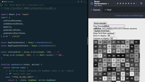 1:19 If we come up here, and I type in something super-fast, then it does not respond super-fast. I want it to respond super-fast, but it does not. What's going on here? While the doc name is hooked up with the rest of this grid, and every single time we type in here, we're making an update to the state which is going to re-render all the cells in that grid.
