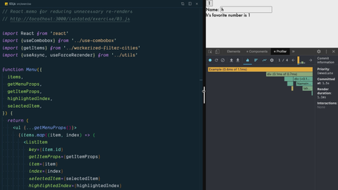 3:57 Go ahead. Pull up the Profiler. Start a profile. Interact with the components here to update some state and see if you can't make it avoid re-rendering components that shouldn't be rendered.