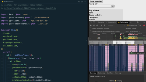3:25 Can you solve that particular performance problem with useMemo? That's the goal of this particular exercise. Then you can take it further by the extra credit. You want to run in production mode. If you want to, you can run the build and serve it locally, or if you want to, you can look at the production deploy and pull up the DevTools there.