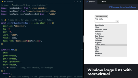 1:08 Let's look at some of the background that I give you here to get yourself all pumped up and ready for this exercise. I'll show you how to use React Virtual, so you get an idea of how to turn a regular list into a virtual list. Feel free to explore that a little bit. You can dive into the docs a little bit, too, if you want to.