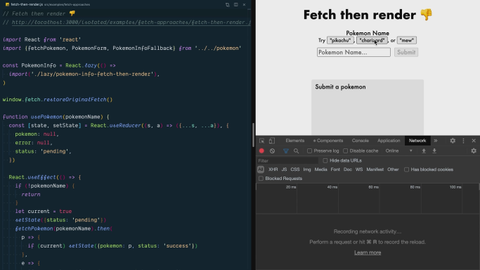 1:39 The next thing that people typically do is called Fetch-then-render. Here's an example of Fetch-then-render. You're still lazily loading the code, but the fetch request happens in the parent right here. We have this usePokémon custom hook that we're using right here to load that Pokémon.