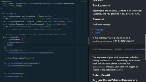 0:10 Your entire job for this exercise is just to refactor. You're going to take all of the suspense related stuff here, create your own usePokemonResource custom hook, and for the extra credit, you're just going to actually use the one that I built for you already.