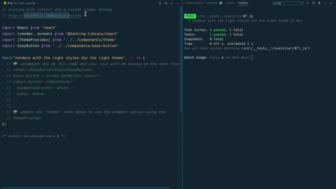 0:25 I give you a little bit of background on the way that we do this. Basically, the idea is the component's not going to work very well if the provider isn't there, so you simply provide the provider. In the router case, that'd be the router. If you're using Emotion's ThemeProvider, then you just wrap that component that needs the ThemeProvider in the provider.