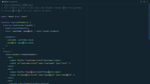 0:28 If we go to our login component, this is what you're going to be testing. It accepts an onSubmit handler, so you'll need to pass a function there. Then it's going to get called with the username and password as properties on an object. You want to make sure that it's being called properly, and you'll need to search around the UI for this username and password field to fill those in properly.