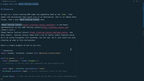 0:36 For this first bit, we're mostly just getting rid of some boilerplate. Feel free to read through the background and take a look at this example of how you use React Testing Library.