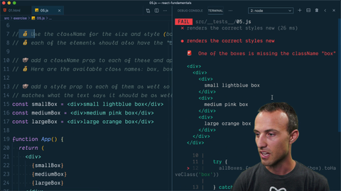 Kent C. Dodds: 0:00 Another thing you might find useful as you're working through this stuff is we also have tests. Not all of the files have tests, but most of the exercises do have tests. They can help you work along your way. I'm going to show you that you don't have to run the tests if you don't want to, but they can be helpful.