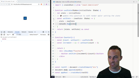 00:47 So your job is to render the counter again, and this is still not going to actually fix the problem for us, but a console.log in here should actually run when you're finished, and that gets us one step closer to having a use state that actually works. So, let's get into it.
