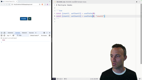 00:00 So, we can totally use multiple hooks in a single component, and the problem is that right now, that is definitely not going to work for us. If we used multiple hooks in the same component, they're both referencing the same state that we had, both the state and the set state function that we've got.