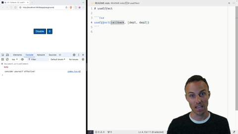 00:00 So now that we have the ability to have multiple use state hooks, I think it would be good for us to try and implement another hook, useEffect. This one has a pretty simple API. It doesn't return anything. It has a callback. That callback can return a cleanup function.