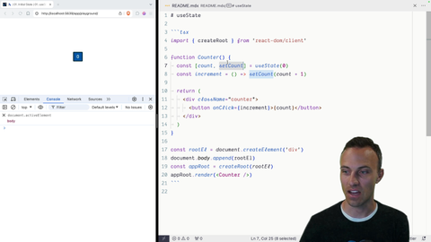 00:33 And we need to preserve the state so that as we re-render, we're accessing the same value of state. So each one of the exercises steps in this exercise is going to be pretty short, pretty quick. But it's very intentional, and I think that you're going to have a good time with it. So let's get started.
