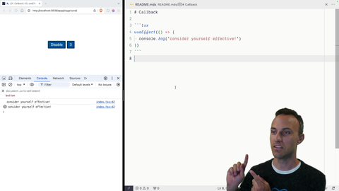 00:00 Kelly, the co-worker, has done us a nice thing and added a use effect in our code base. Right now, it's using the built-in React hook, and so it is working, working just as you would expect. Consider yourself effective. But we want to delete that and implement it from scratch ourselves. You're going to need to have a hook ID