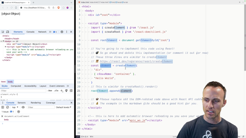 00:15 And now, we still can get the root element, so we've got our HTML ID of root here. And so, we're going to grab that root element. We still want to append something to it, but it's going to be a little bit different with React. So, we still need to create an element that's a little bit different with React as well. So, rather than document create element, we're just going to use create element from React.