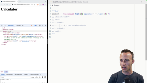 00:00 OK, let's get some more practice with custom components. We're going to have a calculator rendered here. It's not like a calculator with buttons and stuff. We're not quite that advanced with our React stuff yet. But we can make a component that can accept a left, an operator, and a right.