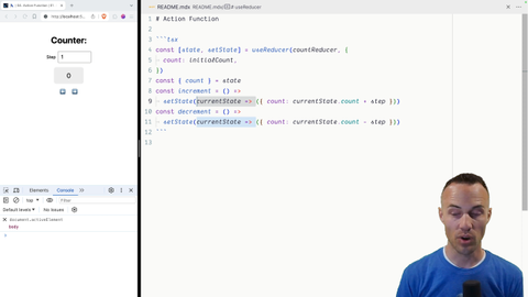 01:31 this is going to get us even closer to the way that this.setState worked back in the class component days. So, should be fun, and we're just taking things a little further and exploring a little bit more what we can do with this useReducer API.