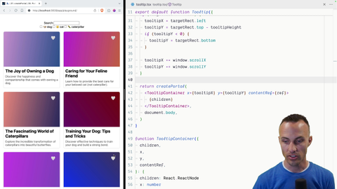00:00 Let's start out by making sure we have this overflow hidden set. So our cards are doing what they're supposed to. And then inside of tooltip TSX, we've got this tooltip container that's responsible for rendering our tooltip where it's supposed to go and all of that. This needs to be inside a create portal.