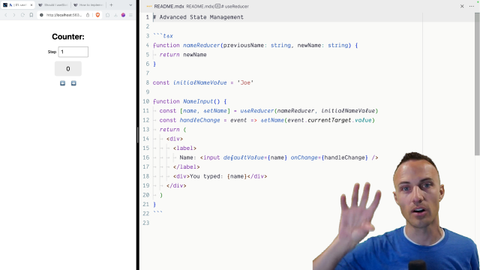 00:18 that useState is not sufficient. So you have a lot of different pieces of logic throughout your component that will set state. Maybe you've got multiple elements of state that are all interdependent, and so that kind of pushes us out of the simple use case of useState. And then there's useReducer,
