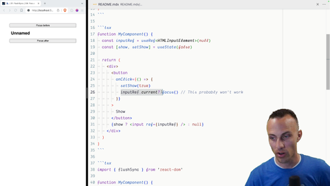 00:56 So here we have my components. We have this state for showing this input. So when we click on this button, set show sets it to true and we re-render and we render the input. Now, if you're doing something like this, you probably wanna focus on that input for the user, you know, just be a nice thing to do. And so you might say, okay, on click,