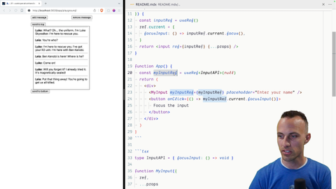 00:34 So we're going to make a focus input function on this ref object. So we add that right here, and when it's called, it's going to focus. Now, this is actually not the way that you use this hook. You'll notice we don't have useImperativeHandle in here at all. And while this will technically work, it's not optimal for various reasons.
