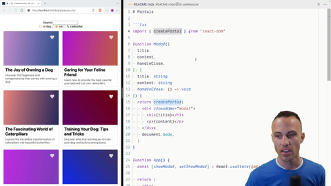 00:54 And so React has a special API called Create Portal that allows you to say, hey, I want this UI to be rendered in this location. Now we're gonna just stick this UI in the document.body. And of course, we're omitting a bunch of stuff for accessibility and things like that