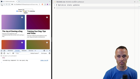 00:00 All right. So we've got something that's a little suboptimal in here. We put some console logs in our code so that we can know when certain things happen. So we're re-rendering the component for the new query. So we're initializing our components. We get a re-render there. And then if I submit right here, that's