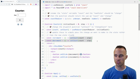 00:00 OK, so we're going to continue our useReducer exploration by updating the setCount to actually be a changeCount function and then pass just the change we want. This will mean that we need to know what the current state is, and then we'll get the change that we want to make.