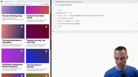 00:00 We've got ourselves a little problem. We have this use effect that measures our position for our tooltip, gets the bounding client rect, so it knows whether to put the tooltip above or below the target where the tooltip should go. Then we set the tooltip height, that triggers a re-render so
