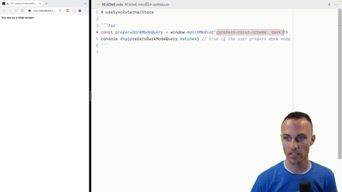 00:00 We've got ourselves a narrow screen notifier. So this text should change as the width of our screen changes. So that is your objective, is to make that work. And we're going to be using USYNC External Store to make that happen. You're going to use the MatchMedia API