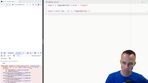 00:15 So if I update our app TSX file to just render the toggle button, take a look at what happens. Hmm, what is going on there? That's not good. I do not like this. Let's go over to our console and see what is going on.