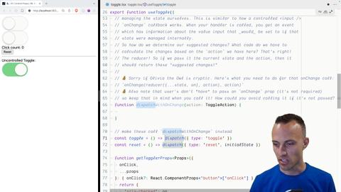 00:00 Super. So let's dive into our toggle component now. We are accepting the on and on change, but we are aliasing on to controlled on because our toggle component actually destructures on from useToggle. So this is the actual state,