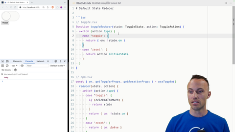 00:00 So there's something that doesn't quite sit right with me, and that is that the users of our use toggle are basically re-implementing most of the logic of our toggle reducer. And our toggle component's not all that complicated, but if it was really complicated, then there's a lot that they're gonna be re-implementing themselves,