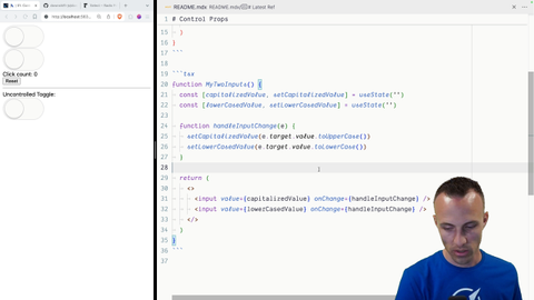 02:24 it's actually handling the change for both of them. We update both of them to be whatever the current value is for the one that changed. So allowing you to control the value of one input, even though that input isn't the one that changed. That's the idea behind control props.