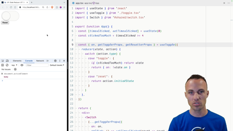 00:51 Reducer defaults to toggle reducer and now instead of toggle reducer. We'll just use reducer. That's it There it's actually a lot. It's more straightforward certainly more straightforward than it used to be. Believe me. It was awful before But yeah, you just accept a reducer and use that instead of your built-in reducer