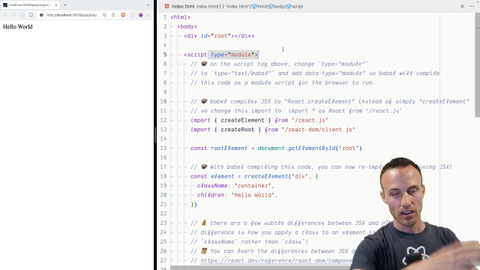 00:38 is to set all that up and then convert stuff over to JSX. As a reminder, this is not the typical way that you run React applications, but I think that it's really valuable for you to see how all these pieces work in a single file like this without any extra tools around it.