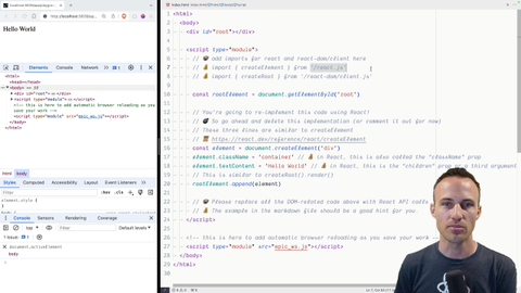00:00 So, for this exercise, we need to bring React and ReactDOM onto the page and use their Create Element and Create Root APIs. You can dive into the public directory of the workshop repo to see what these files are. But, yeah, that's how we're going to get React on the page. As a reminder, this is not typically how you bring React on the page.