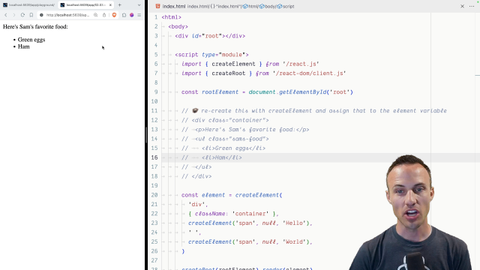 00:19 This is the exercise where you start to appreciate the value of JSX. But we're not using JSX yet, you're still using create element. So have a good time, we'll see you when you're done.