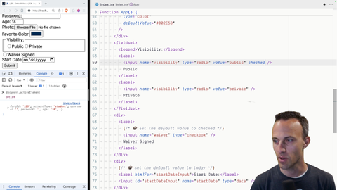 01:47 And so we're no longer going to have the problem with it reset trying to reset a color To an empty string because now we've got a default value set for that So it'll reset back to this default value, which is nice Okay, great. And then we want to default to public So this is where things get a little bit tricky because you actually now have two inputs